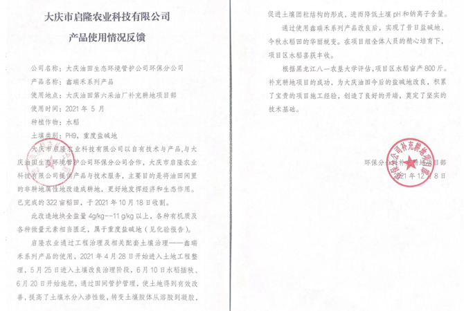 與多所高校、研究院、各大種業企業合作種植改良鹽堿地水稻。在黑龍江、吉林、內蒙古等地有多處示范基地。在新疆等地區種植草木,環境綠化等工程。幾年來,啟隆人大力弘揚“創新、堅韌、拼搏、開拓”的企業精神,在研發上勇攀高峰。大慶啟隆 的企業宗旨是“誠信于鹽堿地的朋友,服務于鹽堿地的朋友”,努力為鹽堿地改良做出積極的貢獻。